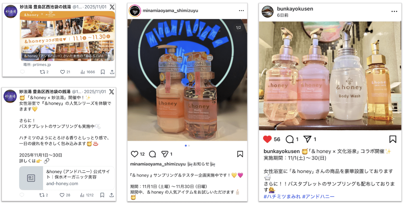 各銭湯施設の公式SNS(X〈旧Twitter〉、Instagram)にて、&honeyシリーズとのコラボ