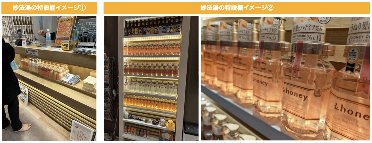 妙法湯の2箇所で特設棚を設置し、実際にタッチ&トライ施策で